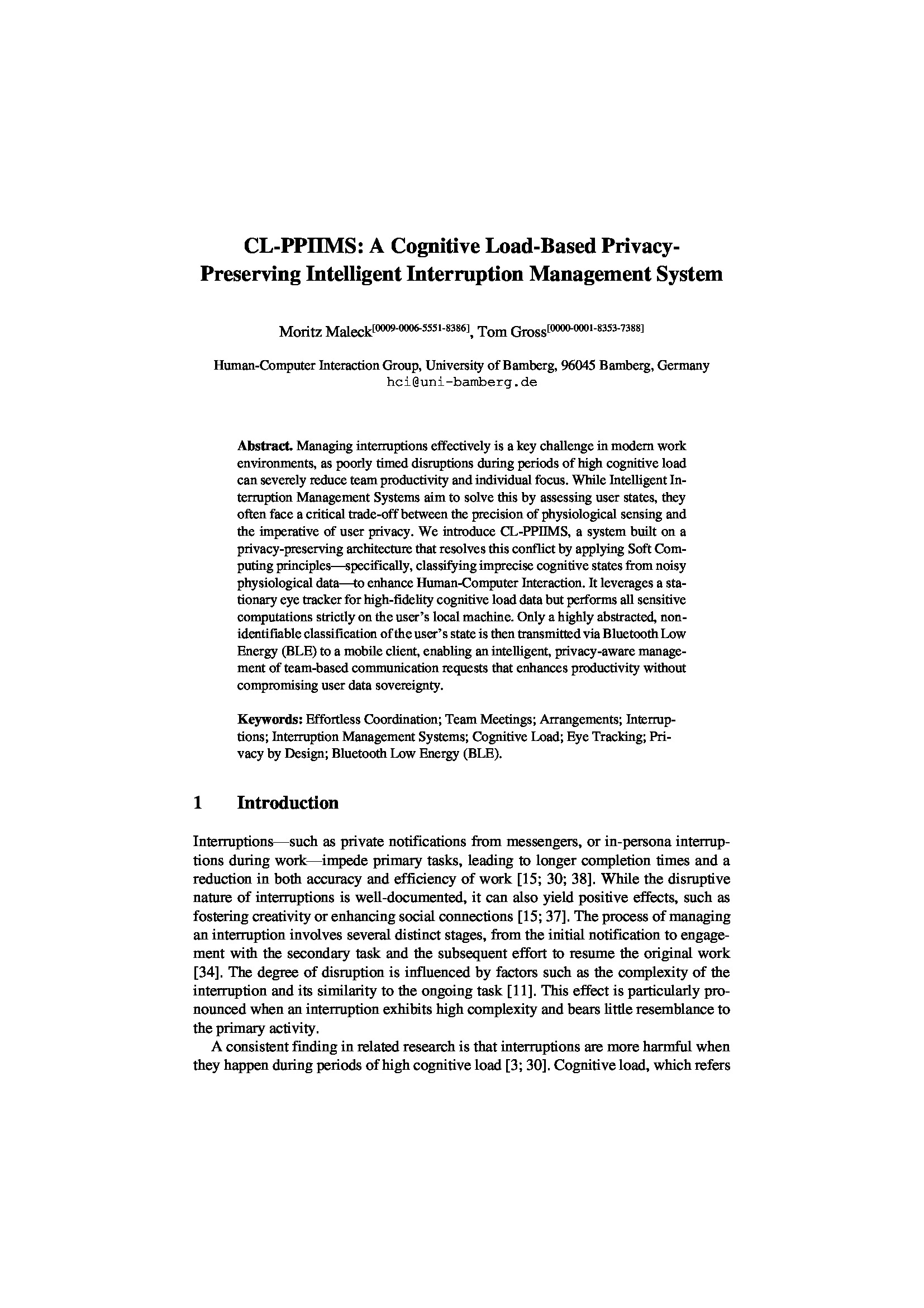 Maleck, Moritz und Gross, Tom CL-PPIIMS: A Cognitive Load-Based Privacy-Preserving Intelligent Interruption Management System. In Proceedings of the Seventh International Conference on Soft Computing and its Engineering Applications - icSoftComp 2025 (Dec. 9-11, Hanoi, Vietnam). Springer-Verlag, Heidelberg, 2025. pp. 405-417. (ISBN: 978-3-032-22061-5). doi:doi.org/10.1007/978-3-032-22062-2. Paper (472k)BibTex