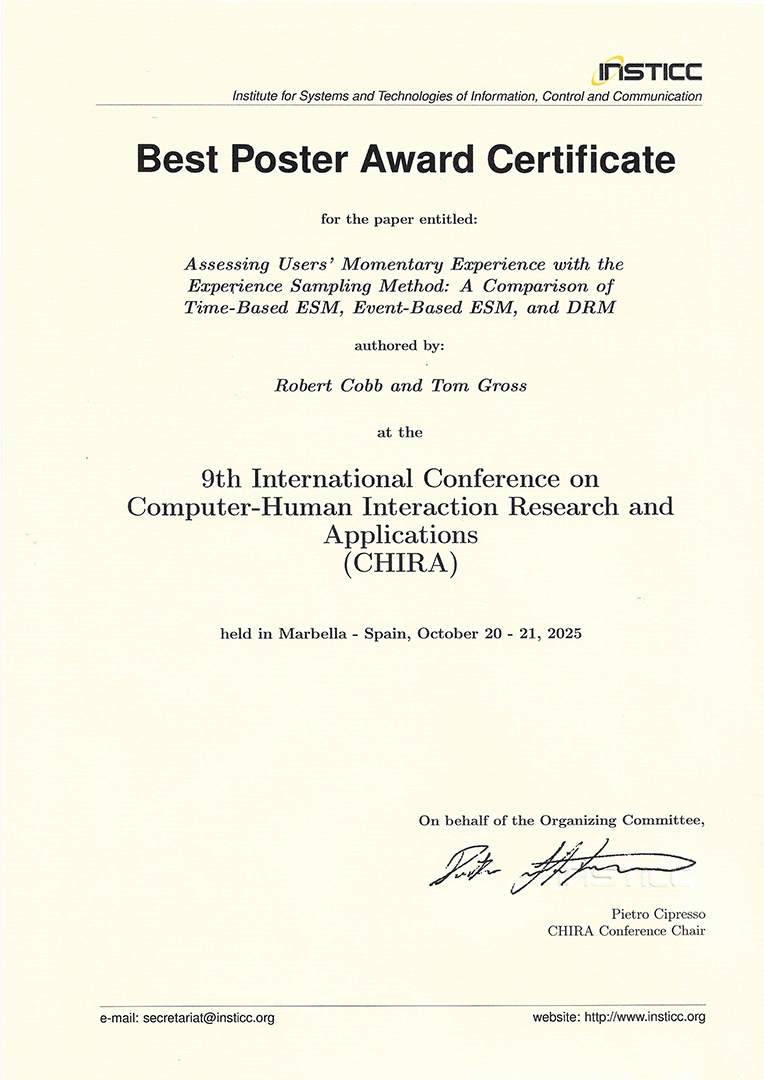 Abstract: The Experience Sampling Method (ESM) is commonly used in human-computer interaction for capturing subjective and situational experiences of users in real time. It can be time-based or event-based. The Day Reconstruction Method (DRM) asks about experiences only on the following day and should therefore be less disruptive for participants. To determine how the three methods differ in terms of quantity and quality of the answers, we conduct a direct and systematic comparison in a between-subject study (N = 17). We compare the count and duration of experience episodes (N = 157) of each method in a quantitative analysis. We find a significant difference between the durations of episodes of the time-based ESM and the DRM, which may indicate a reduced time accuracy with the DRM. Then, we compare the answers obtained in a post-study survey, which do not indicate a greater satisfaction of participants of the DRM for short study periods.